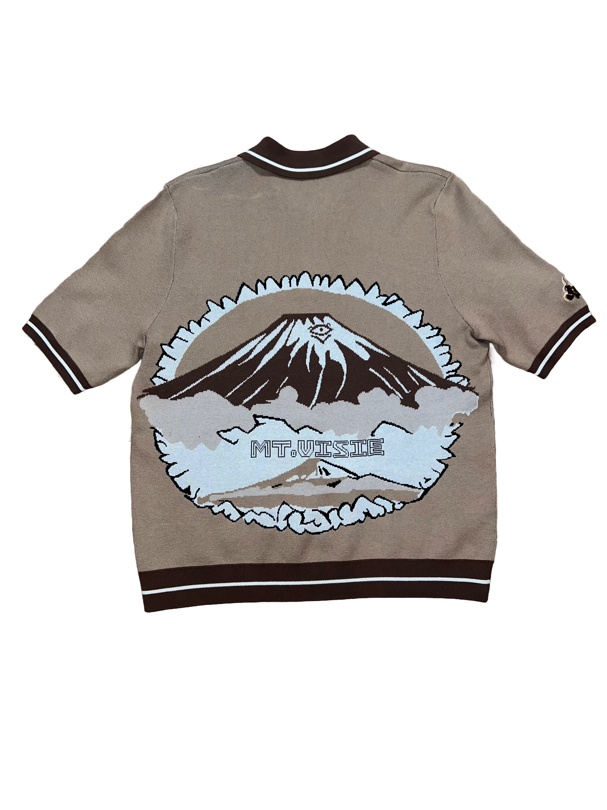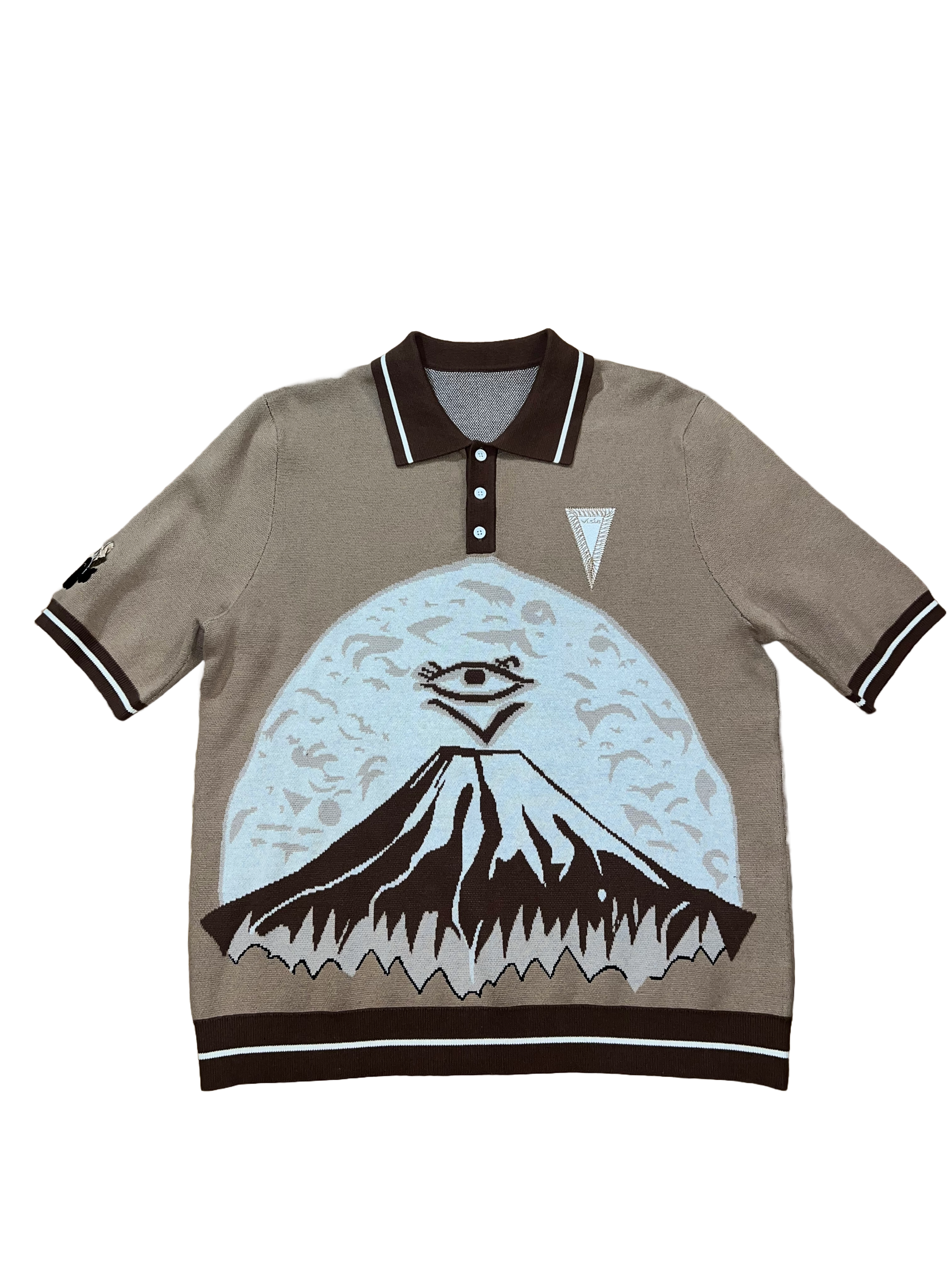 Crafted from 100% organic cotton, this knitted polo boasts an enlarged mountain graphic design as well as a cloud embroidered sleeve. Enjoy sustainable style and comfort with this environmentally-friendly garment.